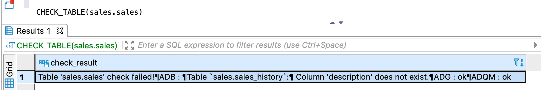 На рисунке ниже показан пример ответа при наличии расхождений. Проверка прошла успешно для ADG и ADQM, а в ADB найдено несоответствие — столбец description отсутствует в одной из физических таблиц.